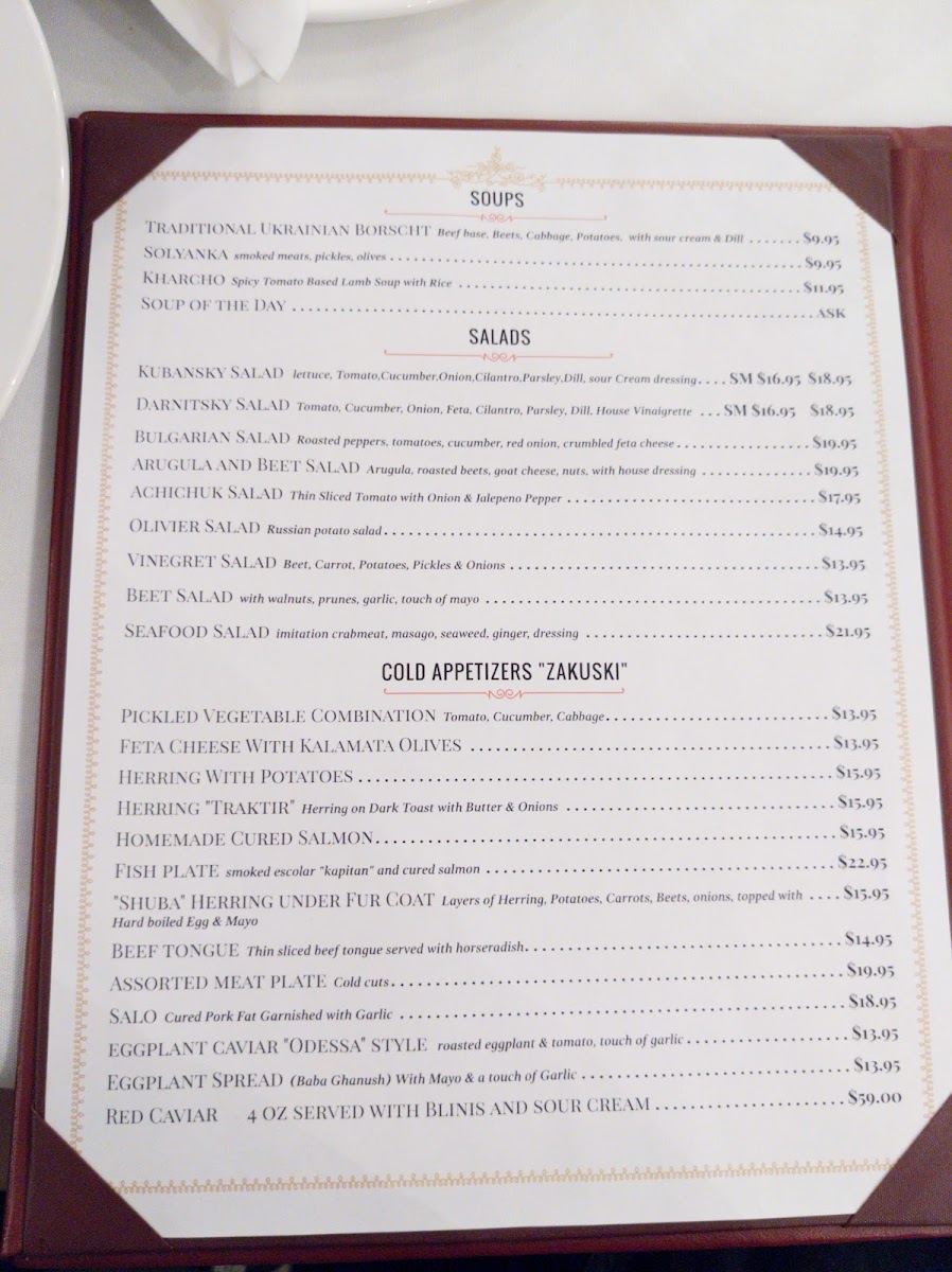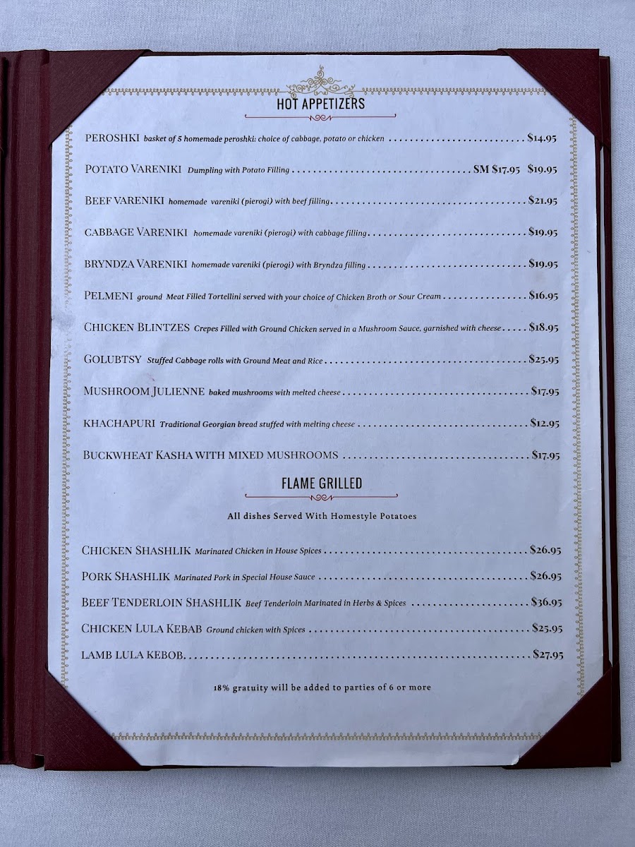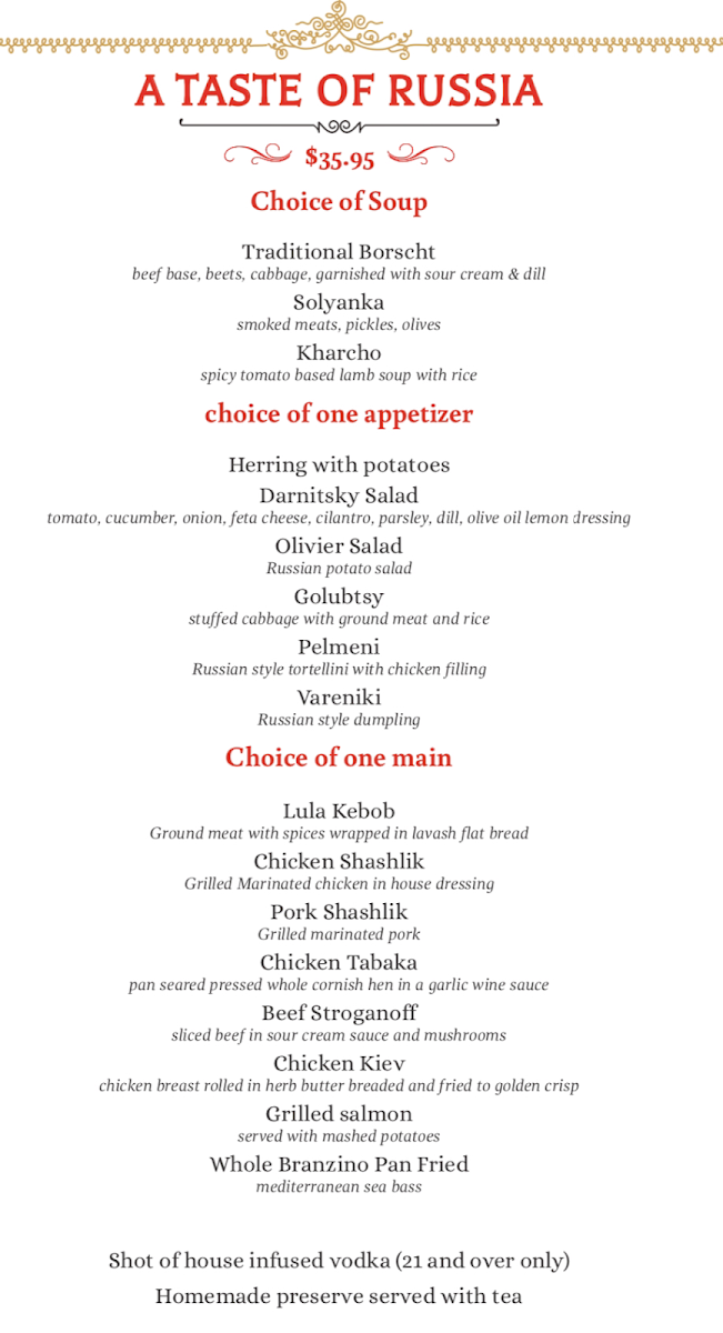 The menu showcases a plethora of hearty dishes, with customer favorites including borscht, which one reviewer calls a must-try; lamb lula kebabs; and beautifully presented shuba and Julien salads. If you’re feeling adventurous, explore their selection of flavored vodkas, best experienced with a flight to appreciate the varied tastes.